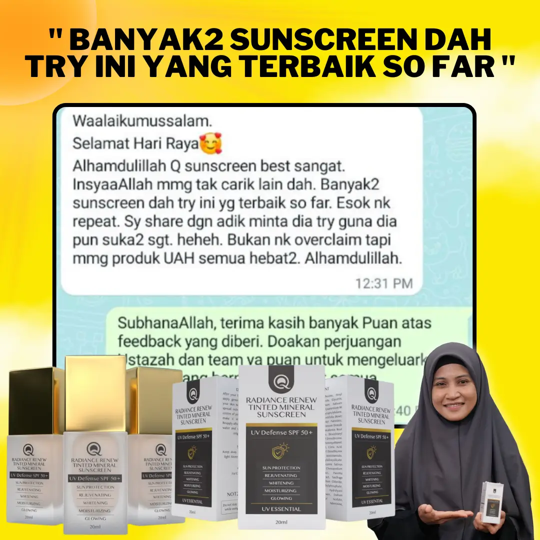 Q Perfection memuaskan hati… sekiranya tiada sedikit pun perubahan berlaku. Selepas anda amalkan selama 3 bulan. Ustazah akan pulang balik duit. Tanpa sebarang soal. Ustazah nak anda MENANG membeli, menang memakai. Lebih ramai orang yang guna produk ni. Lagi ramai yang dapat manfaat. Semoga usaha kecil ustazah ni, dapat bantu ramai orang kat luar sana. Termasuklah anda.