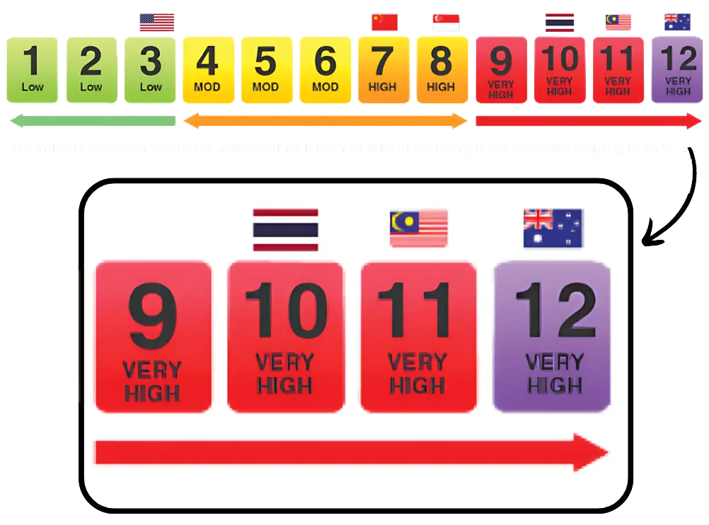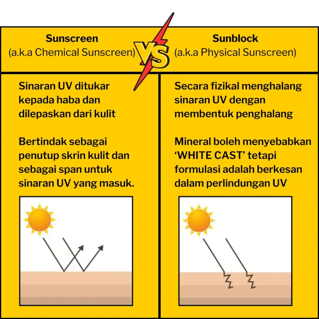 ⚠️Cahaya UVB, akan sampai ke lapisan atas kulit. Sinar UVB boleh menyebabkan pembakaran, keradangan dan pigmentasi pada kulit serta meninggikan risiko kanser kulit.